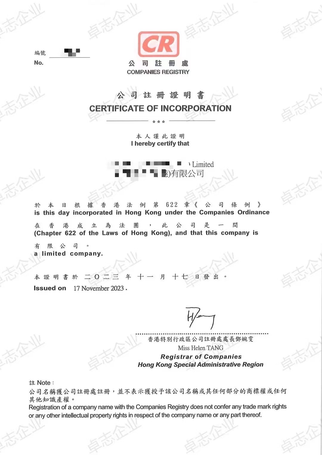 功能:CI證書證明了公司在香港的法律地位和合法經營權,是公司進行日常業務活動、簽署合同、開設銀行賬戶等的重要法律憑據