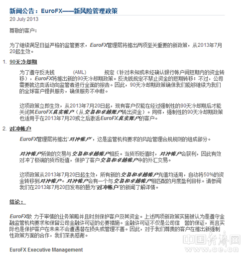 中國經(jīng)濟(jì)網(wǎng)北京11月7日訊(“民生說道”記者 臧允浩)近日,一家名為EuroFX的公司在中國境內(nèi)多省市以投資外匯名義開展理財業(yè)務(wù)。有多名投資者向中國經(jīng)濟(jì)網(wǎng)投訴稱,其用于交易的賬戶自七月份至今,已無法提現(xiàn)。EuroFX公司方面也難以聯(lián)絡(luò)到,有投資者懷疑該公司實際是以炒外匯之名,行欺騙之實。 據(jù)悉,EuroFX自稱是一家權(quán)威的投資理財管理公司,行政辦事處設(shè)在倫敦的梅費爾,客戶中心位于倫敦蒼鷺大廈,是新西蘭金融監(jiān)管機(jī)構(gòu)服務(wù)協(xié)會(FSP)的合法注冊企業(yè),為黃金、白銀、卓越三類客戶提供外匯交易,客戶投資后擁有活期賬戶與交易賬戶,并將資金從活期賬戶轉(zhuǎn)至EuroFX交易賬戶在該公司自行研發(fā)的自動化交易系統(tǒng)內(nèi)進(jìn)行交易,白銀客戶每月保守交易盈利9%,黃金客戶每月保守交易盈利12%,而卓越賬戶每月保守交易盈利則高達(dá)16%。 中國經(jīng)濟(jì)網(wǎng)記者登錄EuroFX官網(wǎng),發(fā)現(xiàn)該公司并沒有在中國設(shè)立辦事處,留下的聯(lián)系方式也是英國倫敦的。記者通過投資者提供的EuroFX公司郵箱向其發(fā)送郵件問詢,但截至發(fā)稿前,仍未收到回復(fù)。 動輒百萬投資 竟無半紙合同 EuroFX公司的收款賬戶 2012年10月,經(jīng)朋友介紹,大連的楊女士了解到一家名為EuroFX的公司正在面向中國人募集資金,這些資金將被用來炒外匯,月收益率高達(dá)16%。“朋友告訴我,之前這項業(yè)務(wù)不向亞洲開放,直到金融危機(jī)后,才逐步放開”,楊女士告訴記者,“如此之高的收益率,再看到朋友現(xiàn)身說法,的確大為心動”。 于是,楊女士便一下投入了60余萬人民幣。中國經(jīng)濟(jì)網(wǎng)記者了解到,EuroFX賬戶的投資額度分三個等級,最低5萬美金是白銀賬戶,月收益率9%,還有最低投入10萬美元的黃金賬戶,月收益率12%,以及最低投入15萬美元的卓越賬戶,月收益率高達(dá)16%。楊女士的賬戶就屬于黃金賬戶。 楊女士告訴記者,投入資金后,EuroFX公司會為投資者建立一個賬戶,登錄其官方網(wǎng)站的個人賬戶后,能看到自己賬戶每日的資金狀況。“前幾個月,的確有其承諾的收益,而且每個周日都可以申請取現(xiàn),公司會在三日內(nèi)為你打款”,楊女士稱,因為看到收益如此可觀,且能及時兌現(xiàn),她把最早的收益也相繼投入到自己的賬戶里。 2013年4月,湖南長沙的張先生也在朋友的勸說下,投入65萬元人民幣,此后又追加到260余萬人民幣。 同樣是今年4月,遼寧鞍山的任先生,也從朋友處聽到這一“好消息”,沒有太多遲疑,他也投入了60余萬元開立了黃金賬戶。 與以上幾地的投資者相比,廣東深圳的王女士算是投資額度較小的了。王女士告訴記者,自己向來謹(jǐn)小慎微,但在朋友反復(fù)勸說下,她還是為自己開立一白銀賬戶,投資額達(dá)30余萬人民幣, 中國經(jīng)濟(jì)網(wǎng)記者調(diào)查發(fā)現(xiàn),雖然上述投資者投資額度由數(shù)十萬到數(shù)百萬元人民幣不等,但他們無一人與EuroFX公司簽署過任何書面文件,而這種投資關(guān)系的建立,完全憑借親朋好友的介紹。上述楊女士像記者透露,朋友與自己實際是“上下線”關(guān)系,介紹一位投資者加入會有相應(yīng)的提成。 中國經(jīng)濟(jì)網(wǎng)記者登錄EuroFX網(wǎng)站,在其“常見問題解答”一欄中有信息顯示:“Euro Forex的每位客戶都需要獲得另一位活躍客戶的推薦。新客戶需要獲得老客戶的推薦,以保證我們業(yè)務(wù)的誠實性。如果沒有合適的推薦人,用戶無法自己注冊為客戶”。 有投資者懷疑,這其實是借鑒了傳銷發(fā)展會員的手法,只不過是借理財?shù)拿x,在網(wǎng)絡(luò)中大行其道而已。 賬戶突然凍結(jié) 至今無法提現(xiàn) EuroFX公司發(fā)布的公告 2013年7月20日,對于這些習(xí)慣了每日登陸EuroFX賬戶,查看收益情況的投資者們而言,的確不是一個好日子。 長沙的張先生仍然記得,就是在這一天,他登入自己的賬戶后發(fā)現(xiàn),賬戶當(dāng)天并沒有交易記錄,也沒有產(chǎn)生應(yīng)有的利潤。 類似的情況,同樣發(fā)生在其他EuroFX投資者身上,不久他們就看到公司的公告。公告顯示,為了遵守反洗錢 (AML) 規(guī)定(針對未知或未經(jīng)確認(rèn)銀行帳戶間短期內(nèi)的資金轉(zhuǎn)移),EuroFX將推出新的90天冷卻期政策。反洗錢規(guī)定不禁止資金的短期轉(zhuǎn)移;不過,公司需要就這類活動向監(jiān)管者進(jìn)行全面的報告。因此,90天冷卻期政策確保我們能夠繼續(xù)為我們的全球客戶提供服務(wù),確保服務(wù)不中斷。 這則公告還宣布,EuroFX管理層將推出“對沖帳戶”,稱此為監(jiān)管機(jī)構(gòu)要求的風(fēng)險管理合規(guī)規(guī)則的組成部分。這項政策從2013年7月20日起生效,客戶往他們的對沖帳戶中充值的金額應(yīng)與交易和卓越帳戶中的余額總和相等。 然而,這則公告仍然不能讓遠(yuǎn)在大洋彼岸的這群投資者放心,長沙的張先生表示:除了這則簡短的公告外,再無更詳細(xì)的說明。究竟賬戶是否安全,更無從得知了。而新公布的對沖賬戶,被一些投資者質(zhì)疑為“公司又一輪斂財?shù)氖侄巍薄?/p> 大連的楊女士向記者坦陳,長期以來,投資人都無法直接聯(lián)系到公司,大部分信息主要依靠“上線”傳達(dá)。三個月的資金凍結(jié)