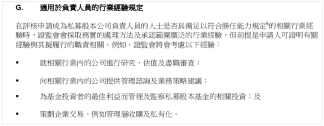 持牌主體不同,LPF運(yùn)營(yíng)成本差異巨大 對(duì)于香港LPF的持牌主體,LPFO并未直接作出規(guī)定,主要由香港證監(jiān)會(huì)的《證券及期貨條例》及相關(guān)法例予以規(guī)管。 根據(jù)《證券及期貨條例》,香港證監(jiān)會(huì)依據(jù)“實(shí)質(zhì)大于形式”的原則,來判斷實(shí)際從事LPF投資管理的主體,而不僅僅是GP、投資經(jīng)理或管理人,甚至投資委員會(huì)等“名稱”。 在判斷哪一主體是實(shí)際從事LPF投資管理事宜時(shí),證監(jiān)會(huì)主要關(guān)注其是否對(duì)LPF的投資享有決策權(quán)。從這個(gè)角度看,香港LPF的持牌主體主要可以是: 1. 普通合伙人(GP)——如果LPF由GP進(jìn)行管理,則GP需要取得牌照,成為持牌法團(tuán)。 鑒于投資決策委員會(huì)并非必須,因此,下面我們主要來看看在不同情況下GP和投資經(jīng)理持牌的運(yùn)營(yíng)成本(如下表)。 以申請(qǐng)9號(hào)牌為例,無論是時(shí)間成本還是財(cái)務(wù)成本都非常高。 首先,機(jī)構(gòu)主體在申請(qǐng)牌照前的6年最少具備3年相關(guān)行業(yè)經(jīng)驗(yàn),至少委任2名符合條件的投資負(fù)責(zé)人(Responsible Officers,“RO”),其中1名須在香港辦公。此外,至少1名RO是符合香港證監(jiān)會(huì)要求的執(zhí)行董事,并需要提前向證監(jiān)會(huì)尋求核準(zhǔn)資格。 而且,成為RO也是有一定準(zhǔn)入門檻的,必須通過香港監(jiān)管科目考試,并且在三年相關(guān)工作經(jīng)驗(yàn)加兩年管理經(jīng)驗(yàn)后,才具備申請(qǐng)成為RO的資格;而執(zhí)行董事的要求則更高。 《私募通函》對(duì)RO行業(yè)經(jīng)驗(yàn)的要求如下,供參考: