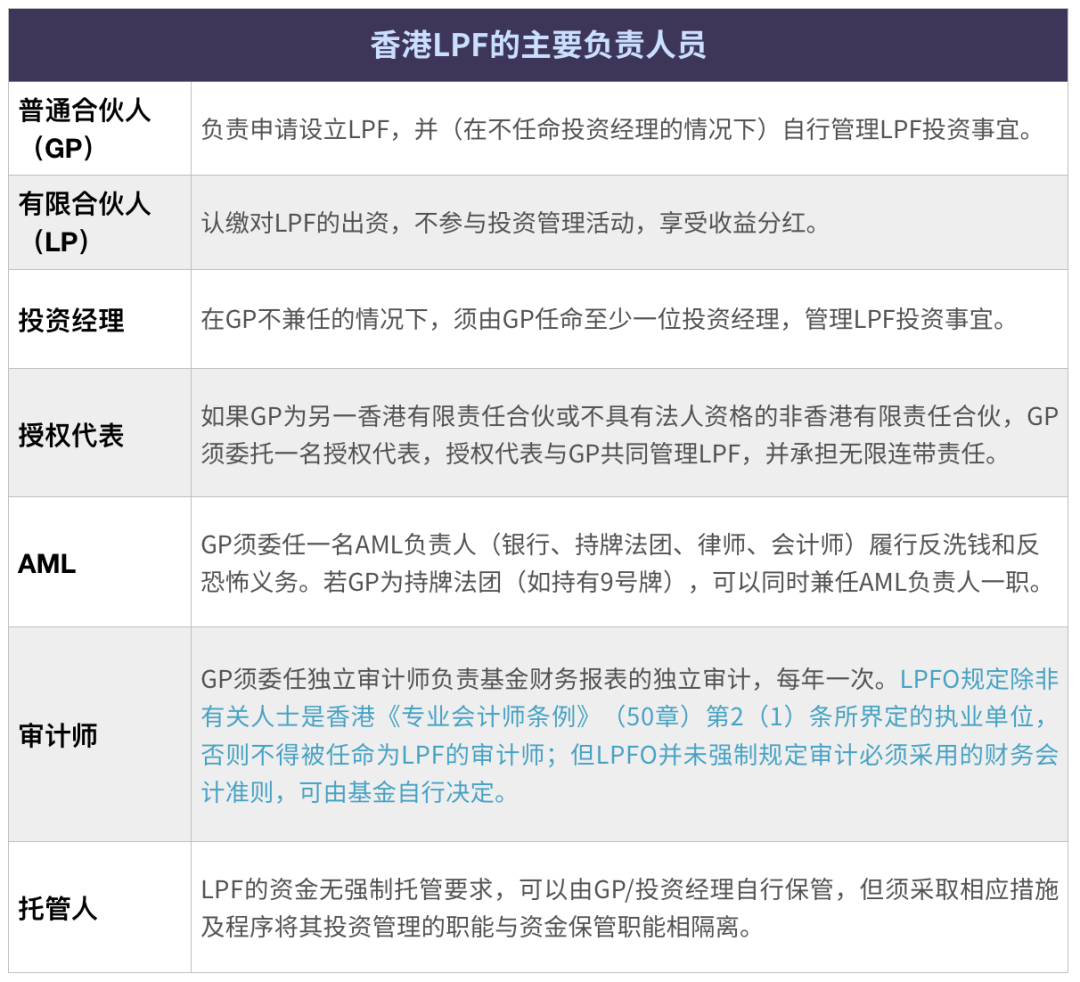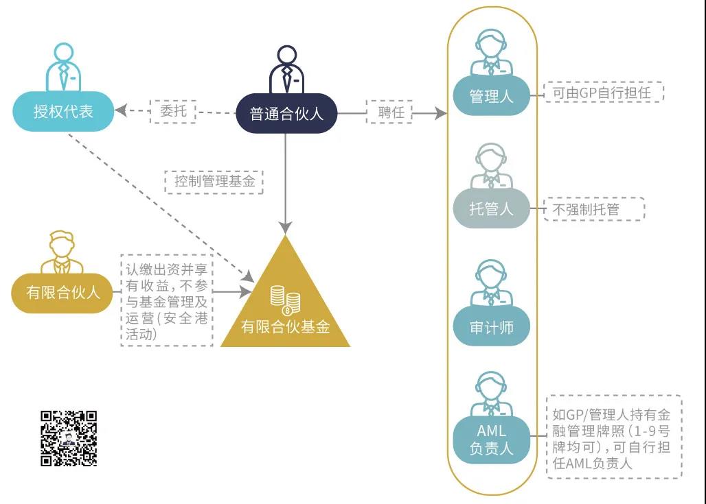 1、向開曼看齊:香港LPF的基本架構(gòu) 根據(jù)香港LPFO,LPF的定義與開曼群島、新加坡采用有限合伙制的私募基金含義基本一致。在一個(gè)典型的香港LPF中,其運(yùn)營(yíng)至少需要涉及到普通合伙人(GP)、有限合伙人(LP)、投資經(jīng)理、授權(quán)代表、AML【1】、審計(jì)師、托管人等重要負(fù)責(zé)人員,基本要求如下表所示: *【1】AML是反洗錢(Anti Money Laundering)的簡(jiǎn)稱,指為了預(yù)防通過各種方式掩飾、隱瞞毒品犯罪、黑社會(huì)性質(zhì)的組織犯罪、恐怖活動(dòng)犯罪、走私犯罪、貪污受賄犯罪、破壞金融市場(chǎng)秩序犯罪等犯罪所得及其收益的來源和性質(zhì)的洗錢活動(dòng)。在證券和私募基金等金融市場(chǎng)中,AML負(fù)責(zé)人員往往是必不可少的合規(guī)風(fēng)控要求,香港LPF也不例外。* 基于上述主要負(fù)責(zé)人員,我們大致可以勾勒出一個(gè)香港LPF的基本架構(gòu): 過去的一個(gè)多月中,我們接到了很多對(duì)香港有限合伙基金(Limited Partnerhisp Fund, “LPF”)感興趣的客戶咨詢,所涉問題很多,包括但不限于: