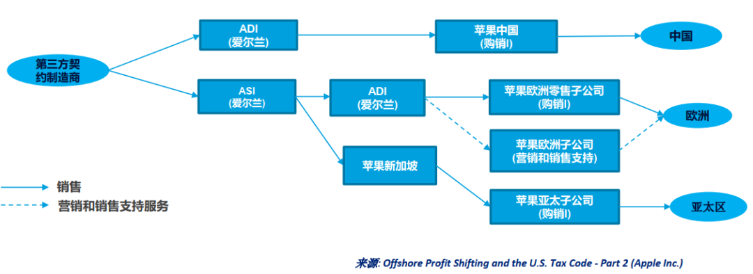 三、以蘋果公司為例 15%稅率意味著什么? 那么,對(duì)于跨國企業(yè)來說,15%的全球最低稅率到底意味著什么呢? 以蘋果公司歷史上進(jìn)行的稅收籌劃為例,蘋果的愛爾蘭關(guān)聯(lián)方(“ASI”)負(fù)責(zé)將產(chǎn)品銷售到歐洲、中東、非洲、印度和亞太區(qū)。Apple Inc.(美國)擁有與蘋果產(chǎn)品有關(guān)的無形資產(chǎn)在美國的經(jīng)濟(jì)所有權(quán),而通過成本分?jǐn)倕f(xié)議由愛爾蘭關(guān)聯(lián)方ASI 及其母公司Apple Operations Europe Inc. (“AOE”) 擁有無形資產(chǎn)在美國以外地區(qū)的經(jīng)濟(jì)所有權(quán)。具體如下: 蘋果的上述稅收籌劃經(jīng)歷了美國和歐盟的多輪質(zhì)疑仍然存活了下來。但根據(jù)G7財(cái)長會(huì)達(dá)成稅收協(xié)議,由于ASI在愛爾蘭的實(shí)際稅負(fù)率遠(yuǎn)低于15%,則Apple Inc. 按最低稅規(guī)則將可能需要就ASI的利潤按照一定的稅率差在美國補(bǔ)稅。 換句話說,如果一家中國的跨國企業(yè)在BVI、開曼群島等地沒有繳納稅收的話,那么其便需要在中國境內(nèi)補(bǔ)繳至少15%的稅收。 四、對(duì)比 全球不同國家/地區(qū)企業(yè)所得稅一覽 事實(shí)上,對(duì)于協(xié)定最低稅率,無論是G7還是OECD,此前一直有不同的版本傳出,有的國家建議應(yīng)定為15%,有的國家建議應(yīng)定為12.5%。 此次G7難得地達(dá)成了一致意見,提出將全球最低稅率定為15%,因而被稱為“歷史性的全球稅收協(xié)議”,更是有媒體認(rèn)為BVI、開曼群島等“避稅天堂”將受到重創(chuàng)。真的會(huì)如此嗎? 在回答這個(gè)問題前,讓我們先看看一些代表性司法管轄區(qū)的企業(yè)所得稅稅率現(xiàn)狀。