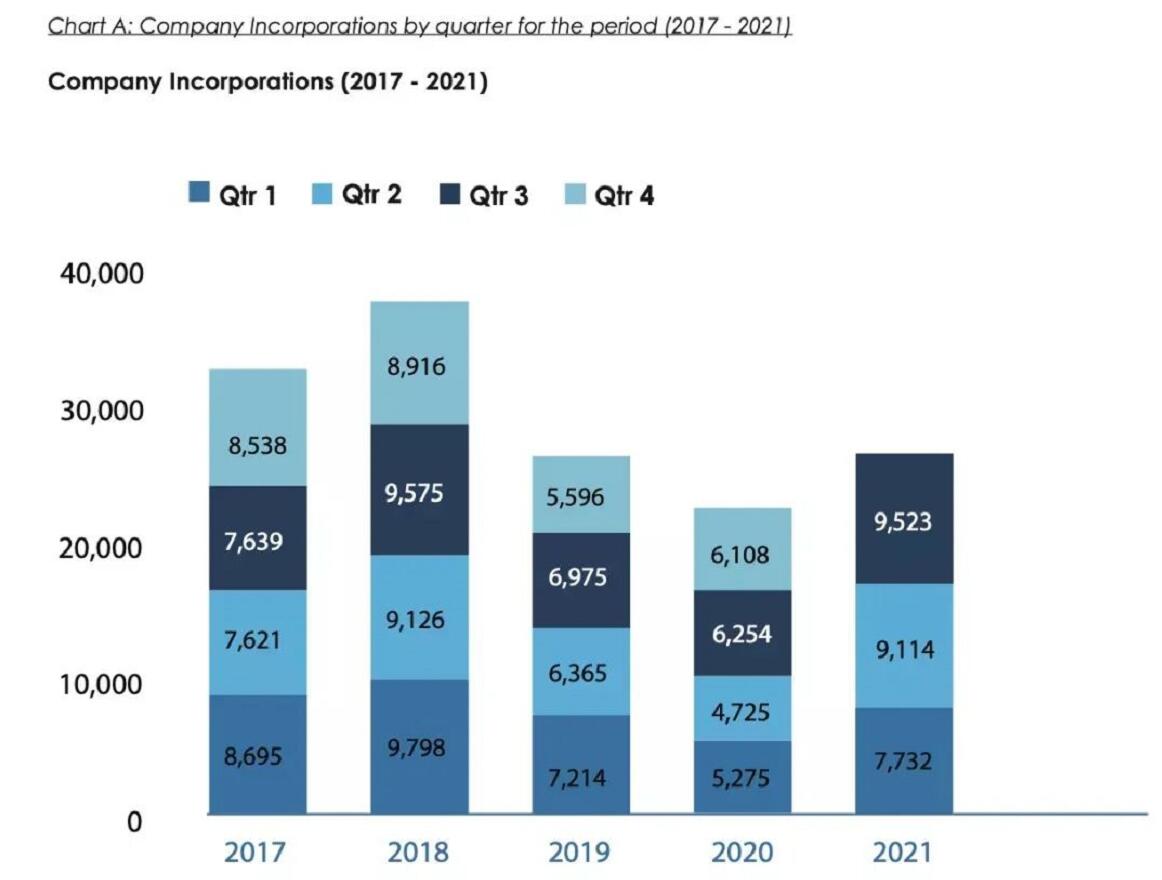 相比之下,外國公司在BVI的登記費用,則全面上漲! 不過,對于絕大多數的跨境投資者而言,基本都是用BVI公司在島外的其他司法管轄區營業,因此,外國公司在BVI的登記費用雖然上漲幅度很大,但實際影響卻很小,幾乎可以忽略不計。 宏杰評論 根據BVI公布的第三季度統計數據,2021年前三季度的公司注冊數量為9523家,同比2020年第三季度的6254家增幅高達近35%;即便與今年第二季度的9114家相比,仍然保持了4.49%的增長態勢。 |