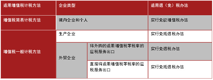 118號(hào)文同時(shí)明確了提供增值稅零稅率應(yīng)稅服務(wù)的企業(yè)增值稅退(免)稅方法的適用。總體原則與現(xiàn)行106號(hào)文的規(guī)定一致。詳見附表。