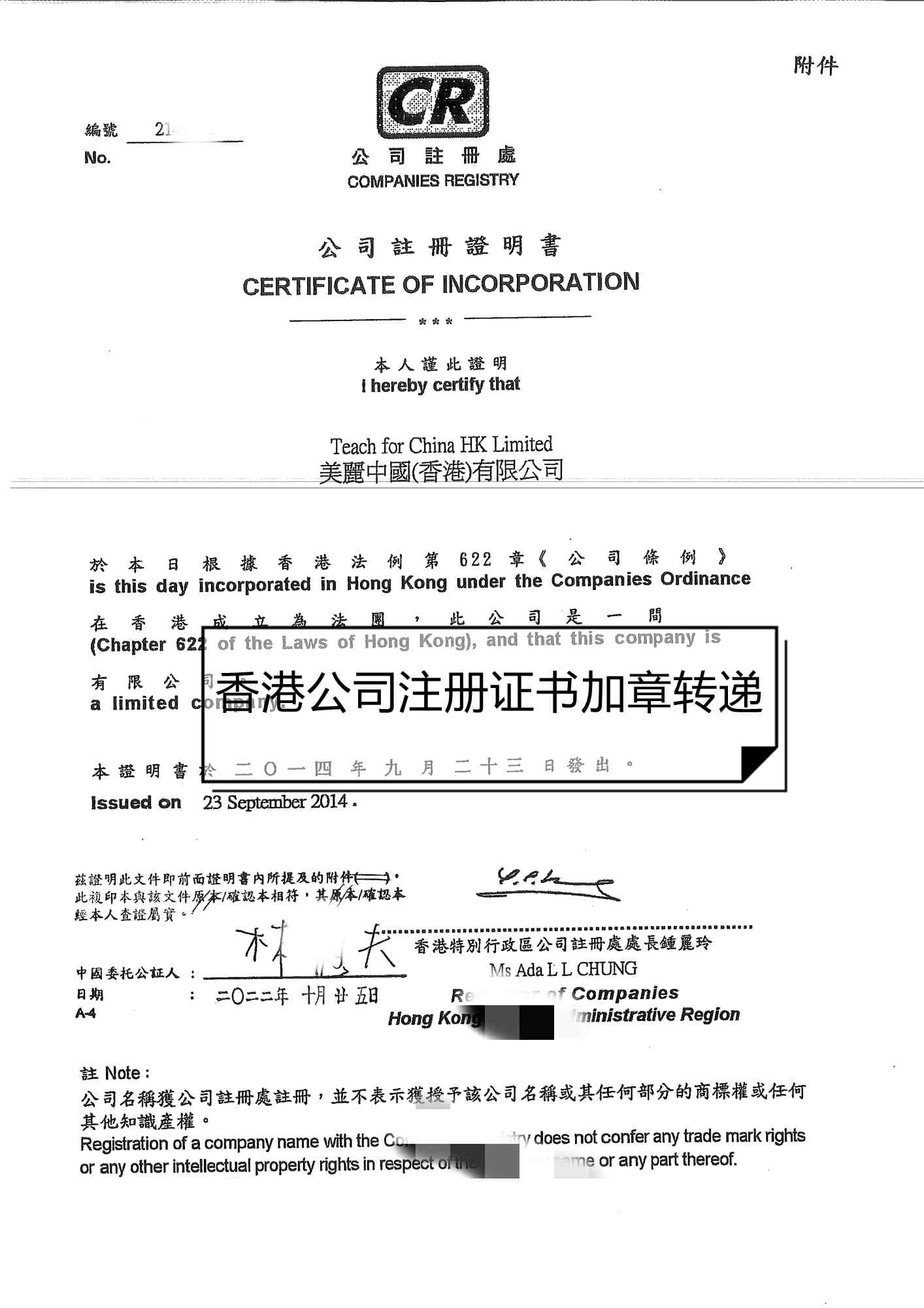送往中國法律服務(wù)(香港)有限公司加蓋轉(zhuǎn)遞章