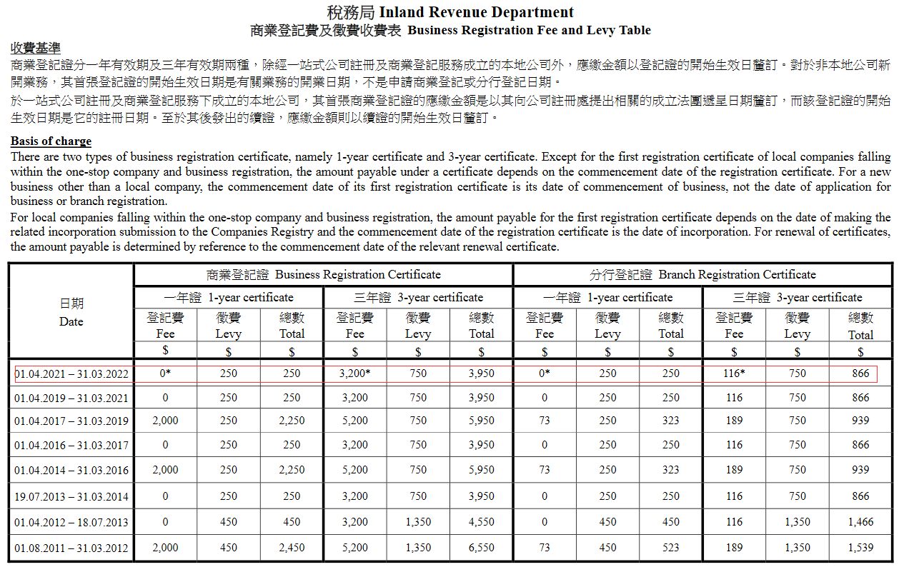 - 經一站式公司注冊及商業登記("一站式登記")成立的本地公司,如成立法團的遞呈是在2021年4月1日至2022年3月31日期間(“寬免期”)提出,根據《商業登記條例》(第310章)第5A(1)(a) 條須繳付的費用可減少2,000元。至于其他個案,在寬免期開始生效的商業登記證或分行登記證須繳付的費用,可分別減少2,000元及73元。