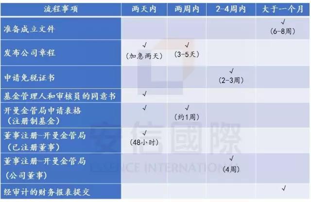 在開曼群島設立私募股權基金,主要流程事項所需時間如下所示: