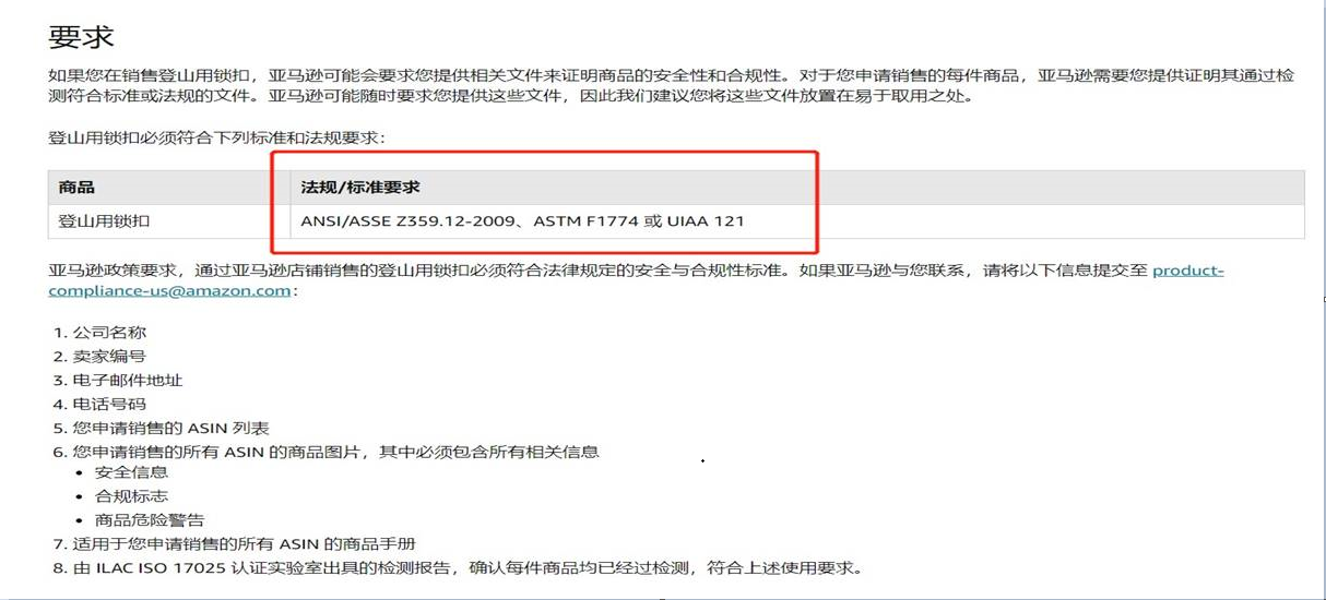 根據亞馬遜要求,所有攀巖產品(裝備)均應經過檢測,并且符合ANSI/ASSE Z359.12-2009、ASTM F1774 或 UIAA 121,其中一項即可。由ISO 17025 認證實驗室出具的檢測報告,確認每件商品均已經過檢測,符合上述使用要求。(幺三幺2999五二0八 同V)