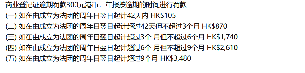 香港公司年審分兩部份,一個是稅務局的商業(yè)登記證更換和注冊處的注冊證書周年申報,下面是有關香港公司年審逾期罰款明細: