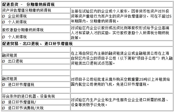 根據《總體方案》,上海自貿區將實施促進投資和貿易的稅收政策,對涉及的所得稅(包括企業所得稅和個人所得稅)、進口環節稅收、出口退稅采 取特殊的稅收政策。大致包括: