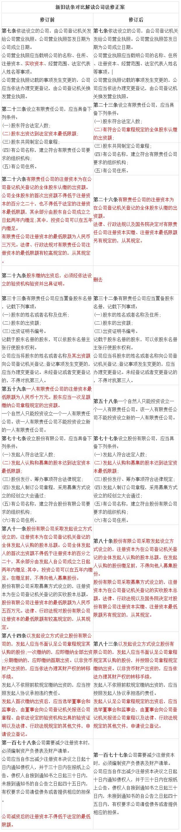 除對公司注冊資本最低限額有另行規定的以外,取消了有限責任公司、一人有限責任公司、股份有限公司最低注冊資本分別應達3萬元、10萬元、500萬元的限制;不再限制公司設立時股東(發起人)的首次出資比例以及貨幣出資比例。
