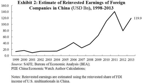 兩種數據中所出現的巨大的、并在逐漸增長的差距,大多是源于再投資收益。商務部并不登記那些不以資本投資的名義上報的再投資。在中國,外國公司和外國投資的收益在2013年可能會達到接近2180億美元。基于在中國的美國跨國公司的數據來看,至少一半的收入將被再投資。作為對比,2013年外國公司上報的資本投資總共卻只有420億美元。從這可以看出,保守估計的話,再投資收益至少占SAFE和MOFCOM外商直接數據差額的60%。