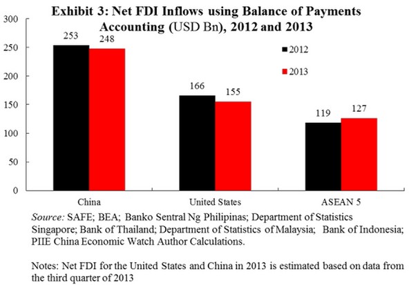 雖然SAFE數據更不頻繁,也更不細致,但它與其他國家更具可比性。因為,SAFE數據是基于國際標準來計算貿易支付差額的。根據SAFE的數據,中國在2012年和2013年仍然是外國直接投資資本流入的首選國家。以中國資本流入的速度來看,中國仍正在FDI的存量上逐漸靠近歐盟和美國。要想趕上中國而成為FDI增長的首要目的地,東盟五國仍然還有很長的路要走。