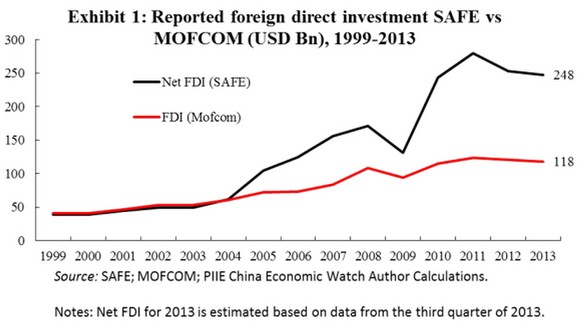 中國在外商直接投資上發布了兩組數據。第一組是由商務部(MOFCOM)發布。商務部的數據顯示,2013年中國僅有1180億美元流入。第二組是由國家外匯管理局(SAFE)發布的。外管局的數據是前一組數據的兩倍。