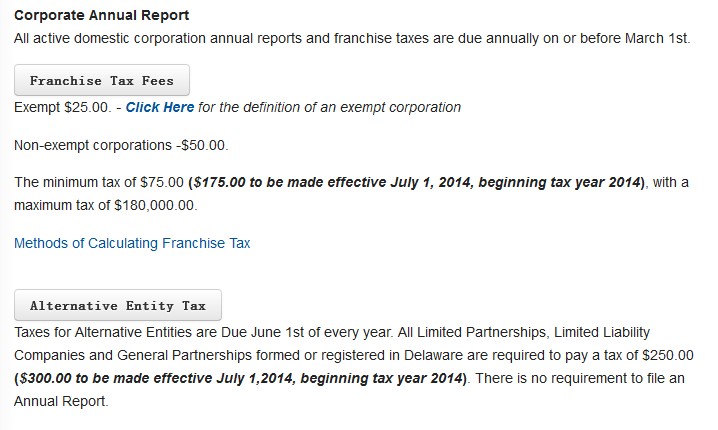 特拉華州有限公司須于每年三月一日前繳交年度特許經營稅,而有限責任公司則須于每年六月一日前繳交。持標準最低股本的有限公司每年須繳付特許經營稅最少 75美元,另加年度特許經營稅報告存盤費用 50美元。有限責任公司的特許經營稅為 250美元。