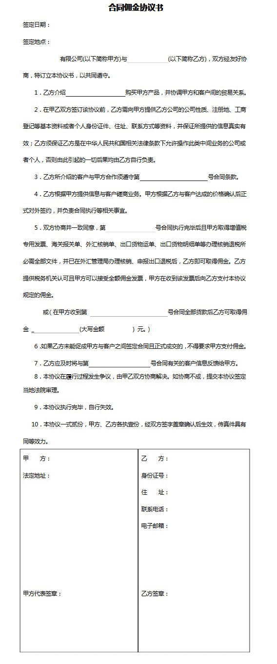 有關(guān)公司A(以下稱買方)和B(以下稱賣方)于2014年X月X日簽署的涉及XXXXXXX(貨物名稱型號)售貨確認(rèn)書XXX(合同號),賣方同意并確認(rèn)付予C公司 USDXXXX(大寫美元XXXX整)以作為其為該合同付出努力的傭金。該款項為合同總金額USDXXXX項下的傭金.賣方收妥買方付出的該筆款項后XX天內(nèi)將相應(yīng)傭金款項電匯至下列銀行及帳號: