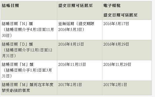 - 如結(jié)賬日期「M」類而在本年度虧損的個(gè)案,提交日期可延展至2024年2月1日,如使用電子報(bào)稅提交日期可延展至2024年2月1日。