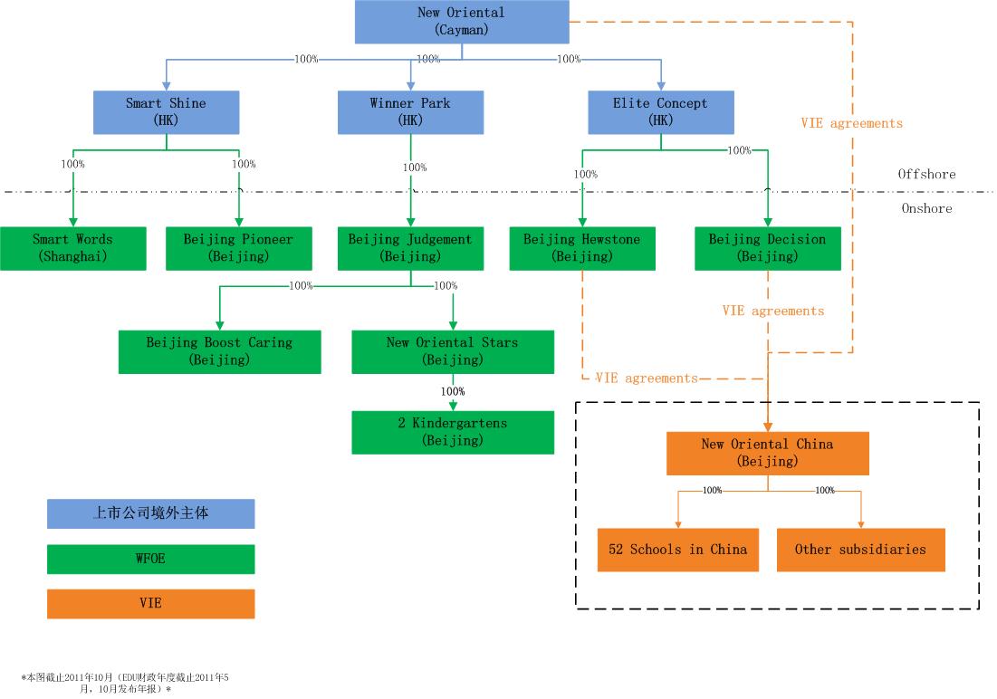 - 關于新東方的結構圖。本來20F上就已經有新東方的結構圖,但是看到你為了更加表明各個公司的性質,增加了一些自己的內容。可是在新東方結構圖里面,WFOE并沒有這么多家。很顯然,三家香港公司直接100%股權控制的公司是WFOE,但是這些WFOE下的公司卻不為WFOE,而是屬于外商投資境內再投資公司。這些再投資公司一般都不再享受外商投資企業的待遇,也不會有外商投資企業批準證書這一身份證明。所以將其歸為WFOE是不正確的。另外,可以看到在右下角橙色的VIE這塊,可能是由于為了圖示美觀的原因你省略了NEW ORIENTAL CHINA的股東這一塊。一般來說,VIE協議控制里面,VIE的股東是協議控制中必不可少的一部分,因此省略了原來20F里面的股東這塊,會讓圖示看起來有點怪。