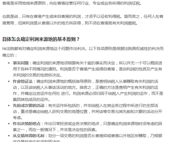 香港采用地域來源原則征稅,即只有源自香港的利潤才須在香港課稅,而源自其他地方的利潤則不須在香港繳納利得稅。這項原則本身非常清晰明確,但在實際應(yīng)用上,有時可能會引起爭議。為清楚說明如何運用這項原則征稅,我們擬備了這本《地域來源征稅原則簡介》。這簡介扼要解釋如何運用這項原則,并附以簡單例子,說明對不同的業(yè)務(wù)實施該項原則時所采用的驗證準(zhǔn)則。如欲更深入探討這個問題,我們建議你征詢專業(yè)顧問的意見。那么在香港不用繳稅,那在大陸呢?問題來了。。你在大陸經(jīng)營,就還得依據(jù)大陸相關(guān)原則,那你香港公司的收入來自于大陸地區(qū),就當(dāng)然需要按照大陸地區(qū)的稅收法規(guī)及政策繳稅了。不過香港公司一般而言是大陸的非居民企業(yè)(但不一定)。根據(jù)大陸的稅法,大陸對于非居民企業(yè)取得源于大陸的收入具有征稅權(quán)。但具體的征稅權(quán)可能會被大陸和香港的稅收協(xié)定限制和修改。具體情況要根據(jù)該香港公司在大陸是否具有常設(shè)機構(gòu),取得的收入性質(zhì)而定。