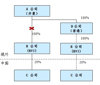 然而,如下圖所示,假設A公司為開曼公司,而D公司為香港公司,由于(1)開曼和中國之間沒有避免雙重征稅的稅收協定;而(2)香港和中國內地的稅收安排規定,如果香港公司持有中國公司(主要資產為非房地產)股權比例低于25%,則股權轉讓不在中國征稅。因此,如果未來D公司再次將B公司股權轉讓時,如果其持股比例低于25%,則中國的征稅權會由此受到限制,從而與A公司轉讓B公司股權相比,會導致中國所得稅負擔減少。在這種情況下,則不符合本條的規定。