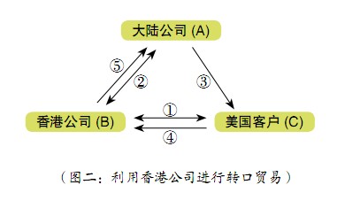 以香港公司為例(參見圖一、二),介紹如何通過離岸公司轉口貿易操作達到避稅的目的。