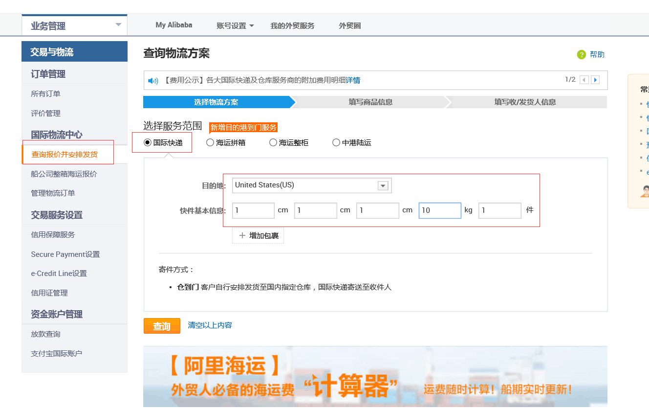 進入“查詢報價并安排發貨”,我們這里選擇國際快遞,以美國為例,選擇一個10kg的包裹