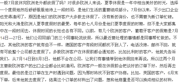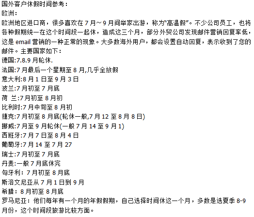 歐洲地區進口商,很多喜歡在7月~9月間舉家出游,稱為“高溫假”。不少公司員工,也將各種假期統一在這個時間段一起休,造成這三個月,部分外貿公司發現郵件營銷回復率低,這是email營銷的一種正常的現象。大多數海外用戶,都會設置自動回復,表示收到了您的郵件。主要國家如下: