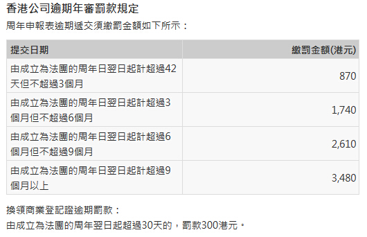 逾期交付周年申報表的公司,須繳付較高的登記費用。逾期交付周年申報表時須繳付的登記費用如下:如周年申報表的交付日期: