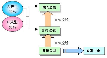 - 為了在香港上市首先按照在內地公司的出資比例在英屬維爾京群島設立公司。收購方和被收購方在合并前后不可有任何的股權變動,只要收購方即BVI公司和被收購方內地公司擁有完全一樣比例的股東,在收購后,內地公司的所有運作基本上完全轉移到BVI公司中。