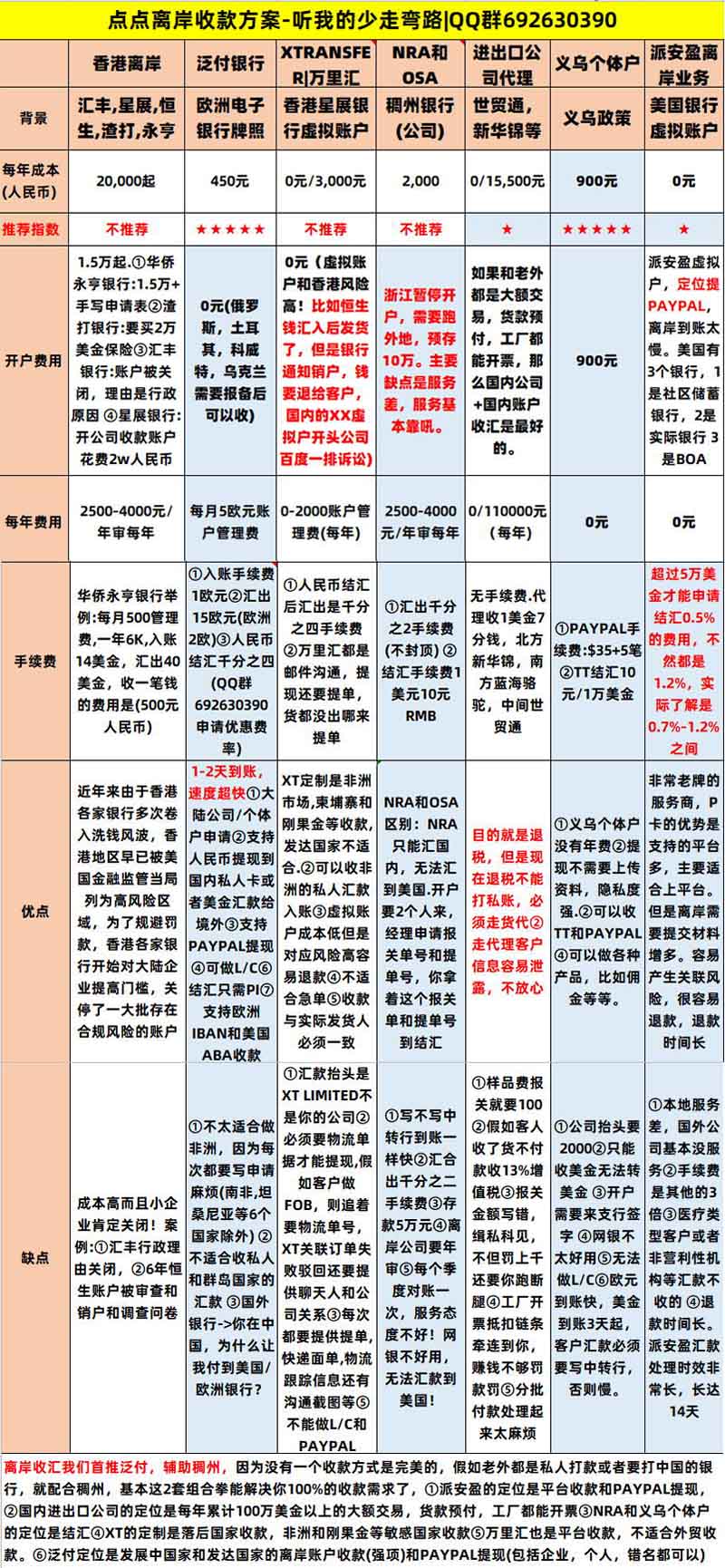 ①現在的情況是一般人不愿意把他的賬戶給你用.因為現在香港開戶非常難,2017年底我去香港開中信銀行,準備一大堆資料,浪費了8000多和1年時間,還吹包開戶成功,開銀行失敗且銷戶就花了2000多,這樣有什么意義呢?2017義烏的物流又幫我收了一年的美金,每筆手續費就高達50$.2018年我的供應商用永亨幫我收了一年的美金,但是最后一次收款時候卻換了賬戶還沒通知我,導致我客戶錢退回去了.