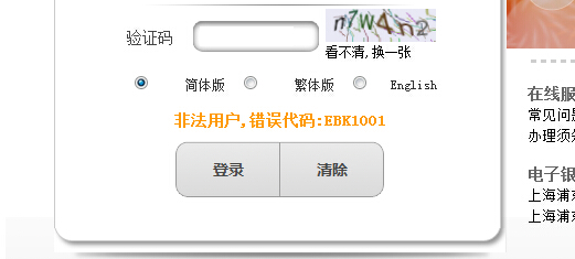 登錄時(shí)提示“非法用戶,錯(cuò)誤代碼:EBK1001” 解決方法:“非法用戶”是由于客戶輸入的企業(yè)客戶號(hào)或用戶登錄名不匹配造成的,請(qǐng)核對(duì)后重新登入。答