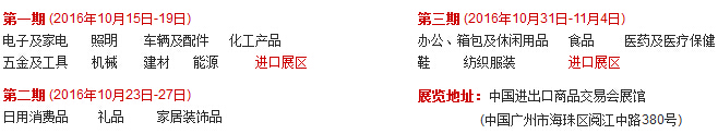 2017年第121屆廣交會 第一期 2017年4月15日-19日 第二期 2017年4月23日-27日 第三期 2017年5月1日-5日 展覽地址: 中國進(jìn)出口商品交易會展館 (中國廣州市海珠區(qū)閱江中路380號)答