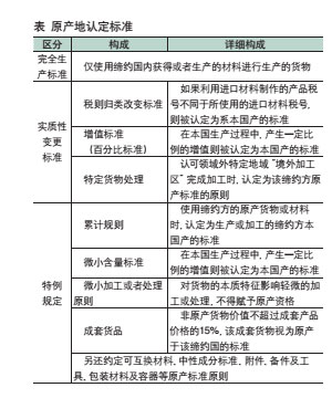 原產地規則的規定一般包括原產地標準、直運規則和書面證明要求。有些區域貿易安排,尤其是自由貿易區對原產地規則的內容還有其他更細致的規定,如原產地累計條款、微量條款和吸收原則、包裝規則和監管等規則等。最初的原產地規則主要是為了海關征稅和進行貿易統計,自由貿易區與關稅同盟等區域性貿易組織的大量涌現使原產地規則已由一種非歧視的海關技術規則轉化為一種新的貿易保護工具。原產地規則作為區域貿易協定不可缺少的組成部分,其重要性正日益加強。