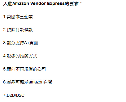 1.美國企業(yè),雖然官方說只向美國本土企業(yè)開發(fā)入駐,但是許多非美國企業(yè)也躍躍欲試,有的企業(yè)甚至注冊了美國公司想盡辦法申請入駐,也有亞馬遜主動(dòng)邀請商家入駐了vendor express。具體可點(diǎn)擊“閱讀原文”參考。