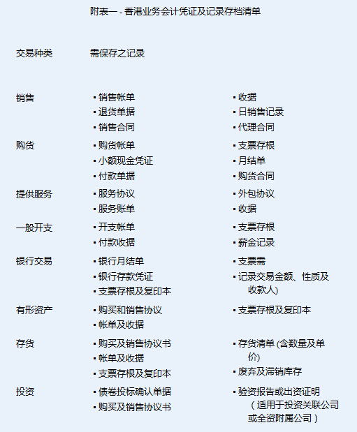 為了幫助客戶更妥善的備存其業務的會計憑證及記錄,我們根據香港稅務條例的要求及稅務局的指引,把一家于香港注冊成立的公司(無論是否在香港境內經營)營運過程中所產生及需要妥善備存的會計憑證及記錄,羅列于附表一,以供客戶參考。