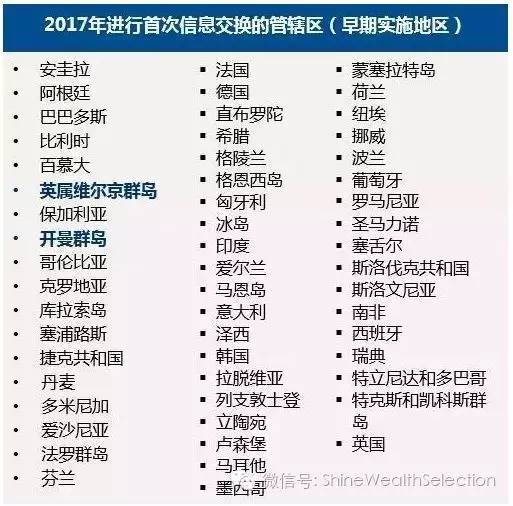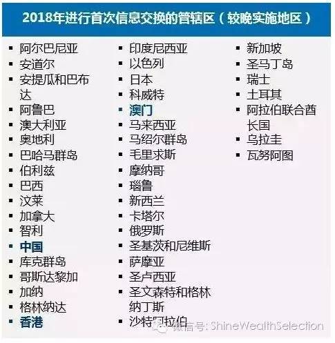 CRS是仿制FATCA而創建的,但其報告的數據要求不同,報告的信息量更大。截至2015年12月11日,已經有97個國家和地區承諾執行多邊自動情報交換,2017年9月,中國個人及其控制的公司在下列56個國家和地區開設的銀行賬戶信息(截至到2016年底的信息)將會主動呈報于中國稅務機關,其中包含眾多投資者熟悉的國家和地區:BVI、開曼群島、百慕大、塞舌爾、盧森堡、英國、法國、德國等等一些重要的離岸金融中心,已經公開同意執行自動信息交換。不同國家處于不同的CRS實施階段,56個國家/地區將在2017年9月1日開始首次信息交換,41個包括中國和香港將在2018年9月1日年開始。