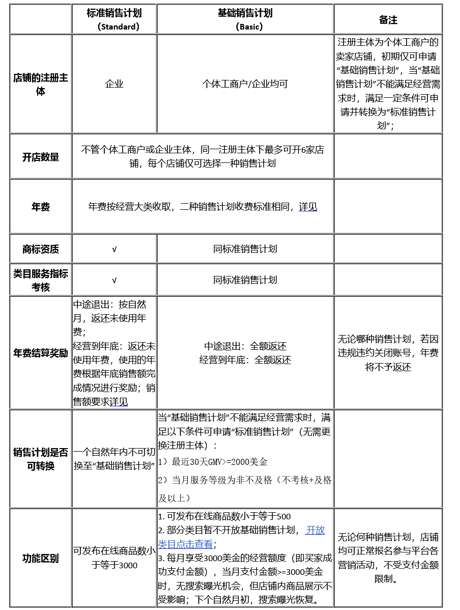 1、速賣通有兩種銷售計劃類型:標準銷售計劃和基礎銷售計劃供商家選擇,一個店鋪只能選擇一種銷售計劃類型。標準銷售計劃和基礎銷售計劃的區別,詳見下表。除此之外,標準銷售計劃和基礎銷售計劃無其他區別: