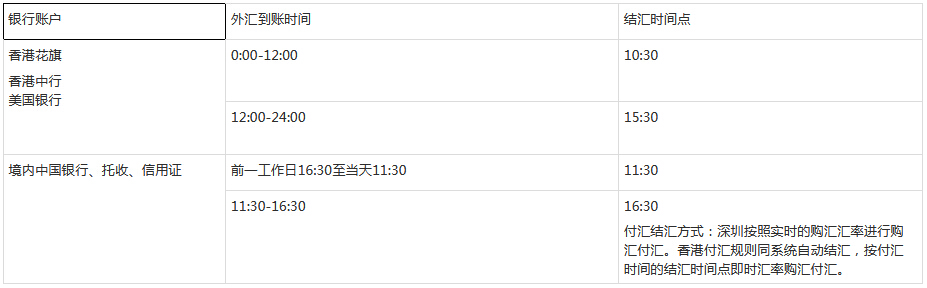 1.系統自動結匯:僅在法定工作日(不包括調休的工作日),一天僅結匯兩次,上午一次,下午一次,時間段內到的外匯按結匯時間點的中行即時掛牌匯率即時結匯(若官網沒有整點匯率,系統會自動選擇整點前一個匯率結匯),如下: