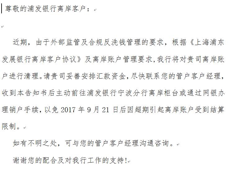 近期,有不少外貿(mào)公司接到浦發(fā)銀行通知,由于外部監(jiān)管及合規(guī)反洗錢管理的要求,根據(jù)《上海浦東發(fā)展銀行離岸客戶協(xié)議》及離岸賬戶管理要求,銀行將對(duì)離岸公司開(kāi)設(shè)的離岸賬戶進(jìn)行清理。
