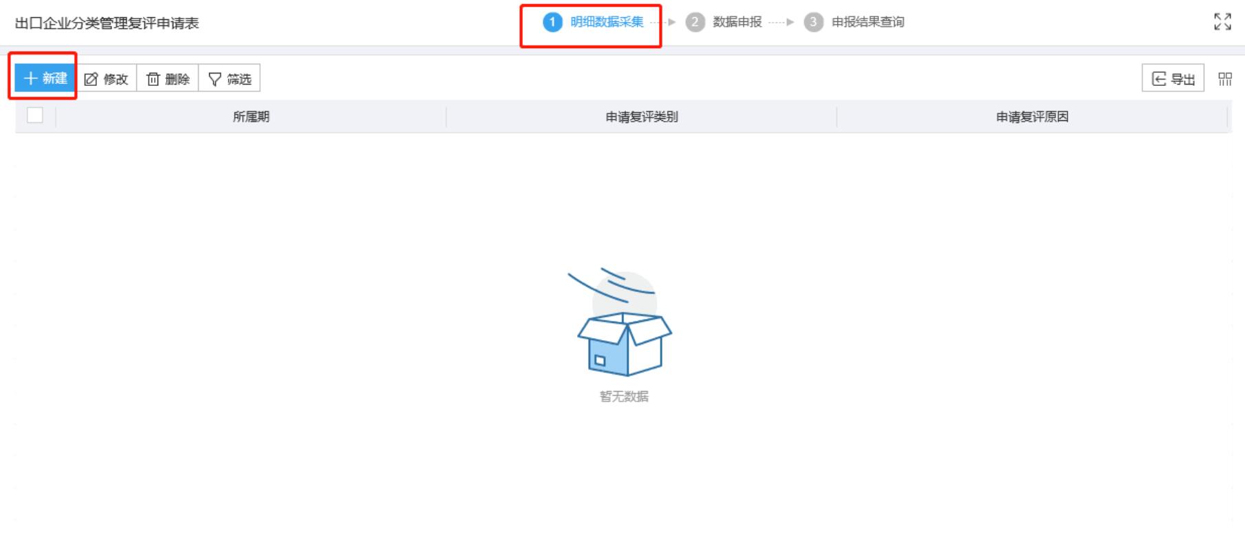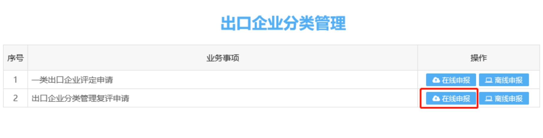 1、登錄電子稅務局》【我要辦稅】》【出口退稅管理】,左側菜單欄選擇【出口企業分類管理】-【出口企業分類管理復評申請】,選擇在線申報。