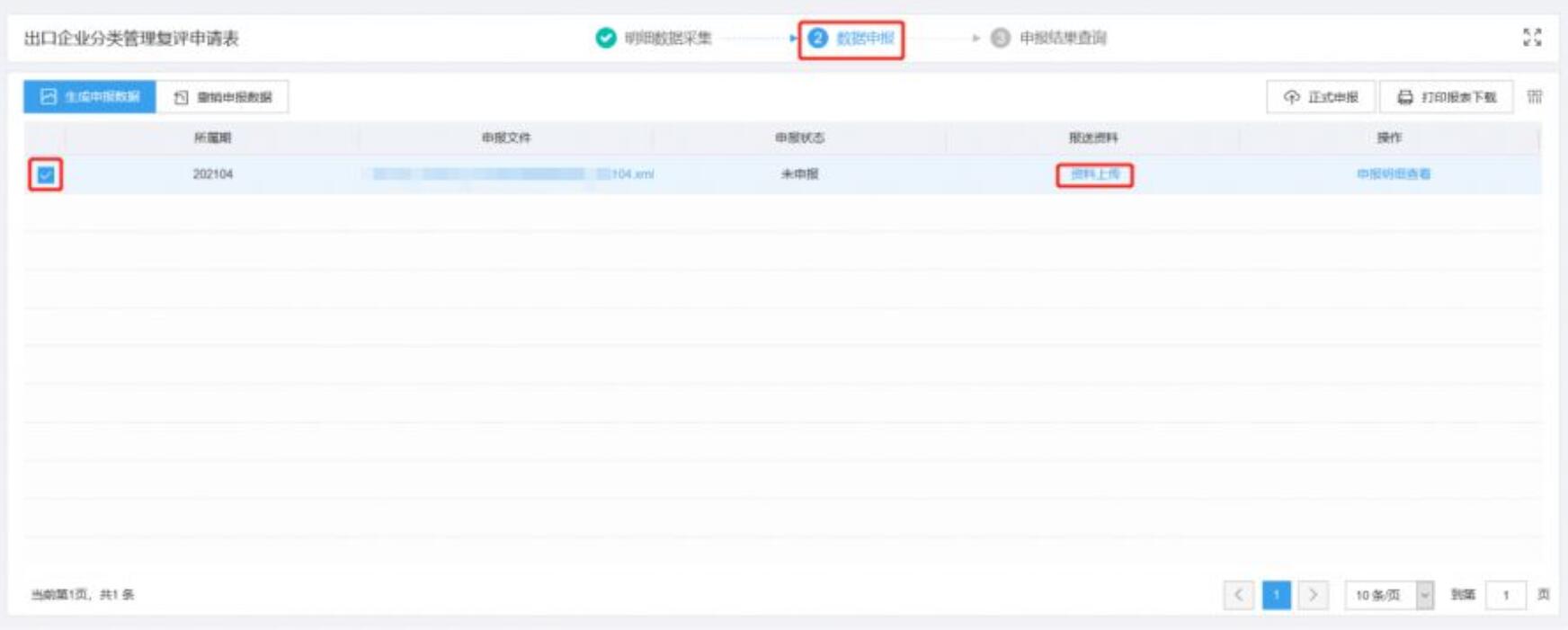 3、采集后,點擊【數據申報】-【生成申報數據】,即可申報數據。在數據申報界面勾選數據,點擊“資料上傳”,彈出報送資料維護窗口,可根據相關要求進行資料上傳,上傳后點擊“確認提交”按鈕。