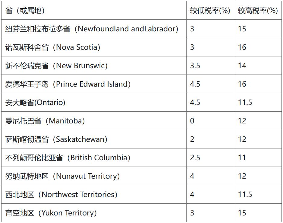 下表列示了各省(或屬地)(不包括魁北克省及阿爾伯塔省,其與加拿大國家稅務局沒有企業稅收協議)的企業所得稅稅率。