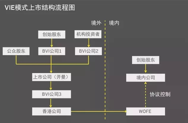 而VIE是在紅籌模式下通過協(xié)議控制衍生出來的架構(gòu)。簡單來說是指境外注冊的上市實體所設(shè)立的WOFE通過協(xié)議的方式控制境內(nèi)的業(yè)務(wù)實體,而境內(nèi)的業(yè)務(wù)實體就成為WOFE的VIE。由于WOFE并不是通過股權(quán)來控制VIE,企業(yè)一般會采用VIE架構(gòu)來解決其營運行業(yè)存在外資擁有權(quán)限制的問題。以下大家可以參照一個基礎(chǔ)的VIE 架構(gòu):