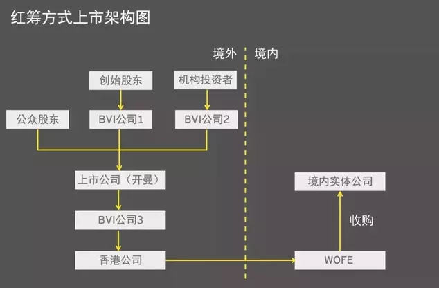現(xiàn)今中國企業(yè)一般是以H/N股形式或紅籌形式在海外市場上市。H/N股形式是指中國注冊的企業(yè)經(jīng)相關(guān)部門和中國證監(jiān)會審批,組建在中國注冊的股份有限公司,申請發(fā)行H/N股上市。中國證監(jiān)會對H股上市政策上較為支持,需時較短,手續(xù)較直接,也不需要為搭建海外架構(gòu)而進行大量的公司重組??墒荋股上市實體為中國注冊的股份有限公司,未來公司在股份轉(zhuǎn)讓或其他企業(yè)行為方面,受國內(nèi)法規(guī)的限制較多,而且全流通目前還僅在有限的試點進行。紅籌形式上市則是指境內(nèi)企業(yè)的實際控制人在境外注冊離岸公司,之后通過該離岸公司所設(shè)立的境內(nèi)全資子公司(以下簡稱WOFE)返程收購自己在境內(nèi)的實體企業(yè),再以離岸公司為平臺實現(xiàn)境外融資或上巿。紅籌形式上巿最大的好處是股票全流通,資金管理較有彈性。但是于2006年,商務(wù)部、國務(wù)院國有資產(chǎn)監(jiān)督管理委員會、國家稅務(wù)總局、中國證監(jiān)會、國家工商行政管理總局及國家外匯管理局共同頒布《關(guān)于外國投資者并購境內(nèi)企業(yè)的規(guī)定》(10號文),當中規(guī)定境內(nèi)公司,企業(yè)或自然人以其在境外合法設(shè)立或控制的公司名義并購與其有關(guān)聯(lián)關(guān)系的境內(nèi)公司,應報商務(wù)部審批。該規(guī)定成為境內(nèi)企業(yè)或自然人搭建紅籌架構(gòu)的重大障礙。大家可以參照以下一個基礎(chǔ)的紅籌架構(gòu):