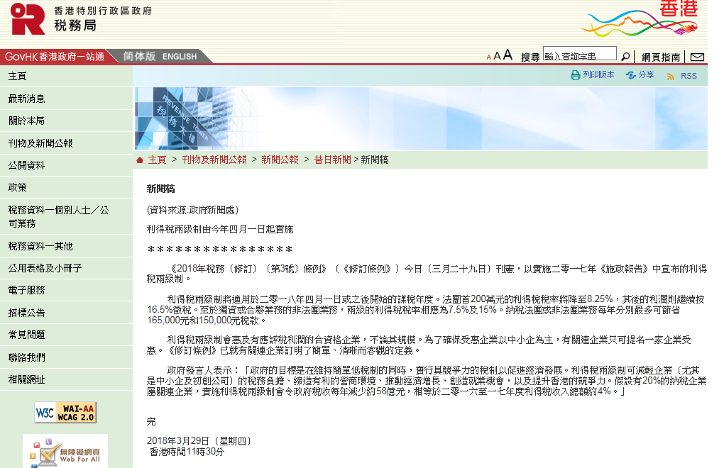 香港《2018年稅務(修訂)(第3號)條例》(《修訂條例》)于昨日(3月29日)刊憲,以實施二零一七年《施政報告》中宣布的利得稅兩級制。
