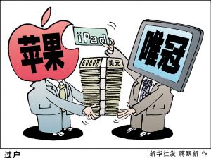 2000年,深圳唯冠科技有限公司在中國內地注冊“iPad”商標,2010年底,蘋果公司訴請確定“iPad”商標權屬,2011年11月17日,深圳中院一審判決駁回蘋果訴訟請求,“iPad”商標歸屬深圳唯冠。2012年2月17日,惠州市中級法院已經判當地蘋果經銷商構成侵權,禁止其銷售蘋果iPad香港產品,這是國內法院首次認定蘋果商標侵權。經過長時間的訴訟歷程,蘋果和唯冠最終達成和解,蘋果支付給唯冠6000萬美元,同事獲得在中國注冊“iPad”商標。