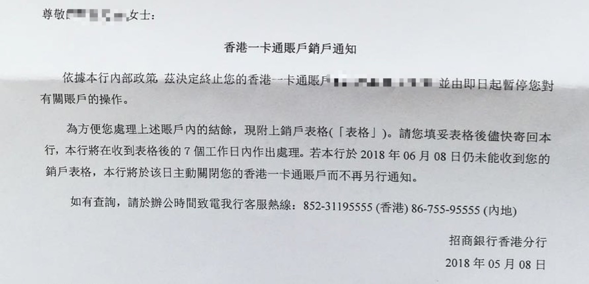 為方便您處理上述賬戶內的結余,現附上銷戶表格。請您填妥表格后盡快寄回本行,本行將在收到表格后的七個工作日內作出處理。若本行于2018年06月08日仍未能收到您的銷戶表格,本行將于該日主動關閉您的香港一卡通賬戶而不再另行通知。