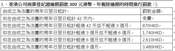 1)香港公司注冊署——完成周年申報文件A 時間:按每一個周年辦理。B 費用:政府收105。C 作用:以做最新的備案,是公司在這一年內有沒有資金、股東、及董事變更、或其他情況等。D 逾期罰款:注冊處周年申報逾期費用詳細(按遞交日期不同收取不同費用):如在由成立為公司的周年日翌日起計超過42天但不超過3個月 HKD 870如在由成立為公司的周年日翌日起計超過3個月但不超過6個月 HKD 1,740如在由成立為公司的周年日翌日起計超過6個月但不超過9個月 HKD 2,610如在由成立為公司的周年日翌日起計超過9個月以上 HKD 3,480最高罰5萬及每日罰700 ,所有責任由董事承擔。要是您的不打算運營的話,您最好是選擇停業(yè)或者是注銷公司,否則的話,要是一直公司不做年檢,欠了政府部門的款項,香港的出入境署是有登記的,這樣對您以后進出香港會有一定的影響。 (2)香港稅務局——更換商業(yè)登記證A 時間:證書上到期的時間。(可以提前1個月領取)B 費用:政府收費RMB450到2,600之間,此費用為政府費用,隨政府的調整而浮動。香港政府會根據(jù)每年的政府財政運營支出情況對香港公司年審的商業(yè)登記證費用做一個調整,如果政府運營狀況好的話,那么價格會相對較優(yōu)惠。C 作用:主要是延續(xù)香港公司的合法經營權利,同時銀行也需要這份文件來證實公司可以繼續(xù)使用帳戶。D 逾期罰款:商業(yè)登記證失效超過30天,即會產生稅務局登記逾期罰款HKD 300 因上述逾期還可能會收到法院傳票,被要求上法院應訴及支付相應的上庭費用。 3. 香港稅務局一般在公司注冊成立日后18個月左右發(fā)出第一份報稅表;之后需每年按評稅基期報稅。