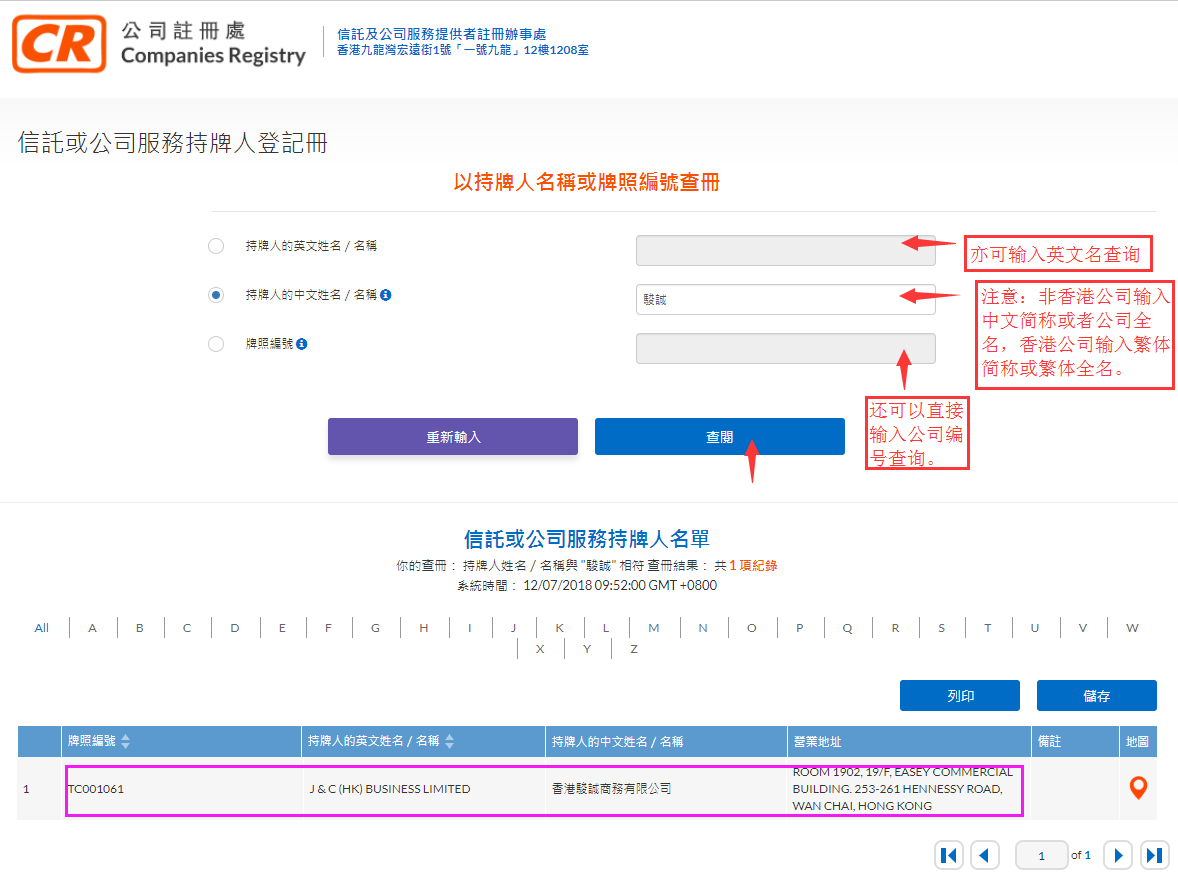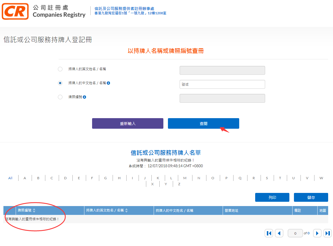 如按以上操作未查詢到結果,則該代理未辦理信托或公司服務持牌人牌照,或者牌照未下發。