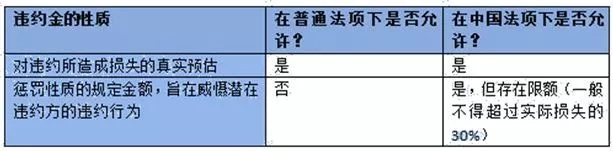 中國法不禁止在合同中規定“罰金”,但會限制其范圍。在中國合同法下,違約金不得“過分高于”實際損失[5]。在實務中,若某一金額超過受害方所遭受的實際損失的30%[6],則其可能被視為“過高”,中國法院可根據實際損失對約定的違約金予以適當減少。這兩種措施之間的差異大致總結如下: