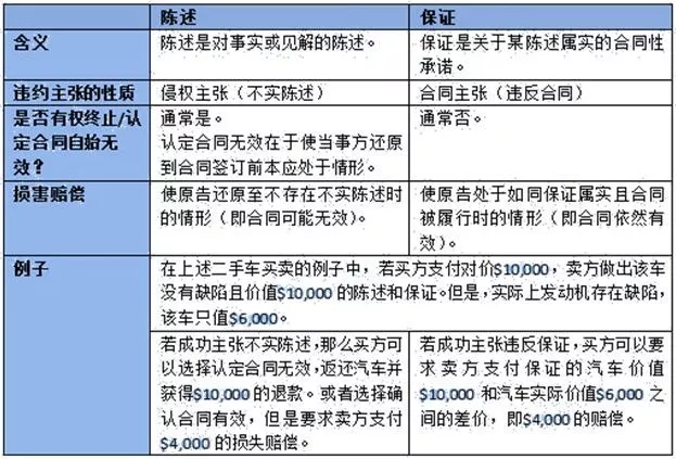 需要注意的一點是,在普通法中,“陳述”與“保證”不同。兩者的區別在適用普通法的并購合同中尤為重要,因為對兩者的使用會影響到一方違約時守約方所能獲得的救濟。以下對比表格簡要概述了兩個概念之間的重要區別: